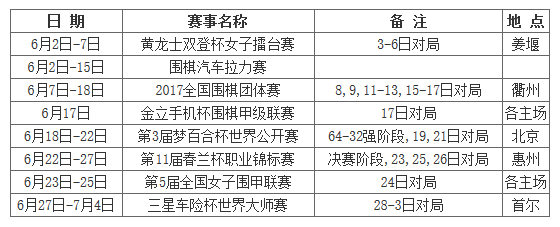 近日,中国棋院公布了2017年6月围棋赛程安排,黄龙士双登杯女子擂台赛与围棋汽车拉力赛月初打响;国际大赛方面,春兰杯决赛、梦百合杯64-32强及三星杯世界大师赛陆续进行;国内各项棋战全国团体赛、男子围甲、女子围甲也将在各主场进行。(新浪体育)