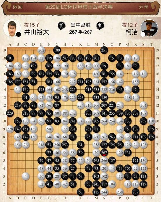 上午8点比赛准时开始,LG杯赛制的用时是每方3小时再加5次40秒,中间没有午休。井山执黑先行以一个少见的高中国流开局,柯洁两个三三应对。布局白棋狂捞实地,欲之后血洗黑模样,黑也欣然收获外势。在左下角好战的井山开始和柯洁纠缠扭打。双方一路从下方交战到左边,两手连扳好棋后突然选择弃子转身,寄希望于右下。可能觉得形势不佳,井山想强杀白棋,尽管十分勉强,但是柯洁局部出现了误算,被井山冷静扎实地127一并,胜利的天平倒向黑棋。官子阶段白棋搜刮追赶奋力拼搏,但无奈黑棋优势太大,不足以构成翻盘。最后260手左右在大概盘10的情况下还有一段小插曲,至于到底出没出棋大家一会可以看下弈客老中医杨冬老师发在弈闻区的变化图。