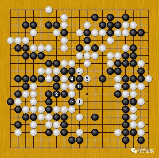 图4:黑163挖(黑三角)的妙味在于,白1跟着应,黑2在补回去,白3一下至黑6的时候,大家可以看到,由于黑三角与白1交换了一手的缘故,白棋已经无法像图2的A位那样去封锁黑棋中央5子了。