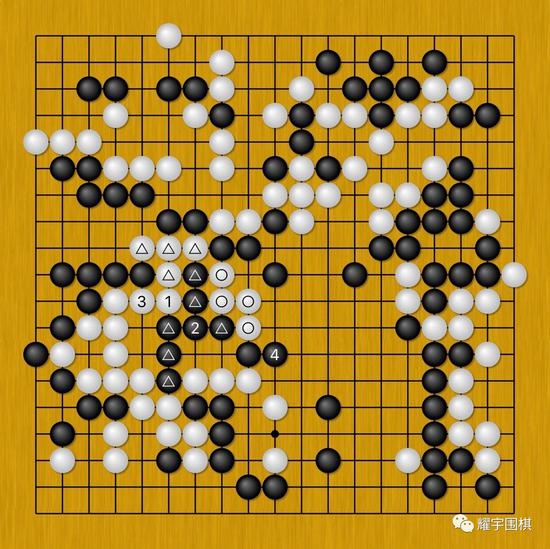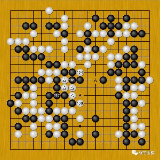 图3:惊人的巧合,当年与AllphaGo那一战,李世石在绝境中使出了“神之一挖”,这一次使出了黑163挖!这步棋的确是一步妙手,当年的神之一挖让AlphaGo崩溃了,这次面对黑163挖,作为人类的连笑,会崩溃吗?下面我们细细解析一下: