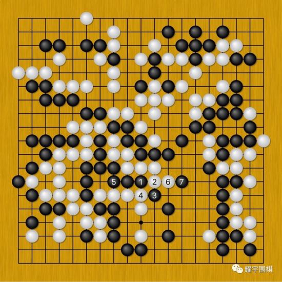 图11:连笑忽略了黑7单顶的好手!此妙手一出,白棋反而被黑棋吃了。黑7这步棋本身并不是很难发现,如果作为一道死活题来做的话,可能业余高段的水平就能做出来。