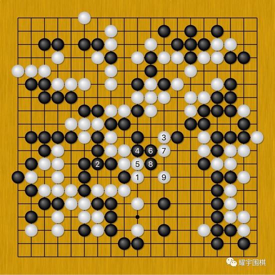 图6:白1打吃,黑2若是补在这个位置,白3是妙手!至白9,之后黑棋中央虽然可以强行突围,但会为此付出很大代价,黑棋不行(之后变化大家自行验算)