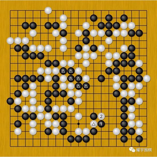 图14:黑1若是随手一挡,就中连笑的计了!白2断!粗看是送死,但却是绝妙手!大家联想一下中央黑三角六子就能品出白2的妙味了。老道的李世石看出了其中的玄机,而为了弥补之前损失而奋起一搏的连笑为此付出了更大的代价。。。。。。