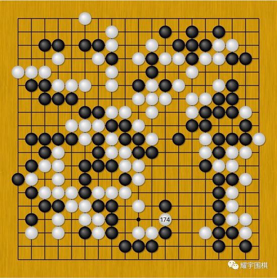 图15:面对连笑白174挖,李世石冷静的选择了黑175将中央黑六子连络,同时封杀了白下方大龙最后的生机。连笑白174设置的陷阱没有让李世石上当,却搭上了自己下方的大龙。