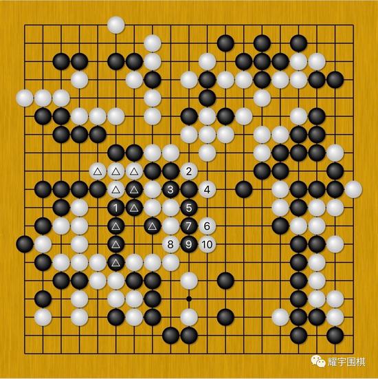 图10:连笑说,他原计划是准备白164与黑165(白三角和黑三角)交换后直接白1以下杀黑中央棋筋的,当时他算到白9一粘后,就觉得黑棋已经死了,可这是他的错觉。。。。。。
