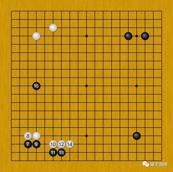 图1:李昌镐执白,布局一开始柁嘉熹黑7就在左下角使出了近来超级流行的点三三,对此李昌镐避开了点三三复杂的变化,选择了白12,14最朴实的应对。当黑15侵分白左边阵势的时候,白棋如何应对?大多数棋手都会选择: