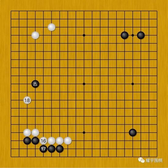图3:面对黑三角侵分,李昌镐选择了白18的下法,这个下法非常少见。但经过这两次实战检验,发现也是可下的(1月19日李昌镐对韩一洲也使出了这一招)。
