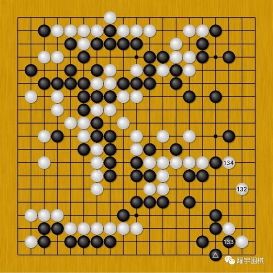 图7:面对黑三角一路打吃,李昌镐没有正面开劫,而是白132,134轻灵转身。就像一位太极宗师,面对对手的奋力一搏,没有正面发力,而是借力打力,将对手的力量化解于无形。此招一出,柁嘉熹已经无法全歼右下白棋了: