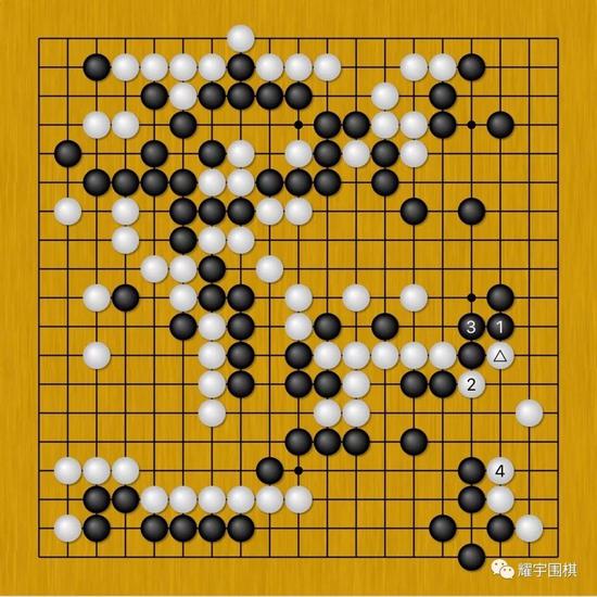 图5:白1爬出要求全活是第一感,对此柁嘉熹必然会黑2,4强杀白棋,接下来的变化比较复杂,不过白棋的成算肯定比黑棋大。