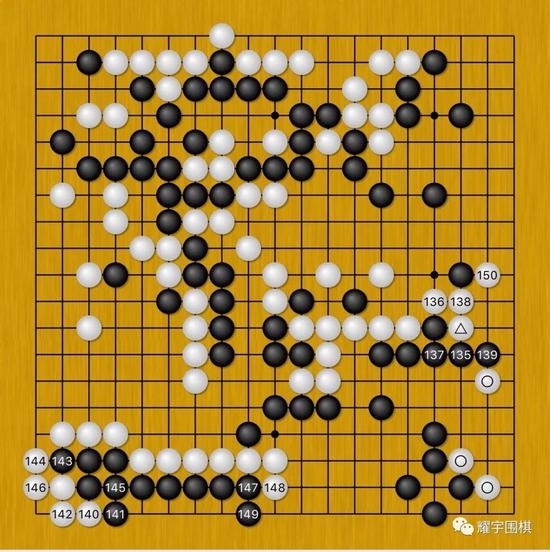 柁嘉熹一看无法强杀右下白全部主力,只好黑135以下吃掉白右下一半棋子。从局部的角度来看,李昌镐右下圆圈三子被吃,黑棋右下收获也很丰盛。但从全局来看,李昌镐弃掉了右下三子,换来了白136,138,150三颗子,达到了破坏了黑右边一部分阵势的目的,兵不血刃的将优势转化为胜势。