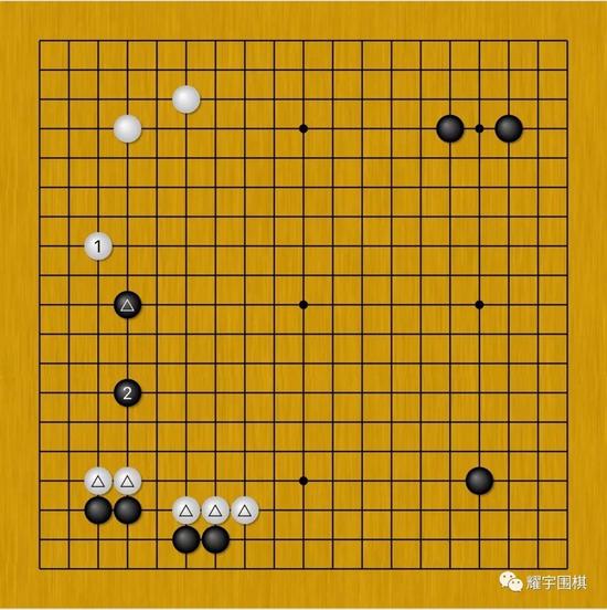 图2:白1利用白左下三角外势背景攻击黑棋。黑2高拆二后,由于左下白三角五颗子没有根据地,所以谁是原告谁是被告,将取决于今后双方的博弈结果。在职业棋手的实战棋谱中,白1的下法是主流。但李昌镐对此却有自己的想法:
