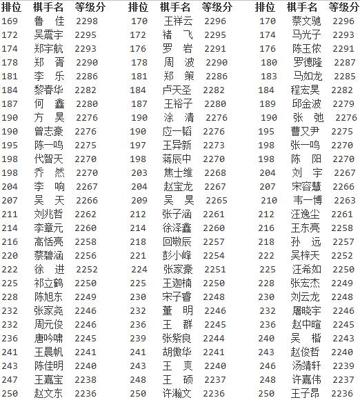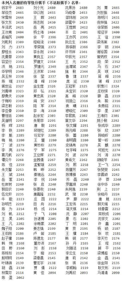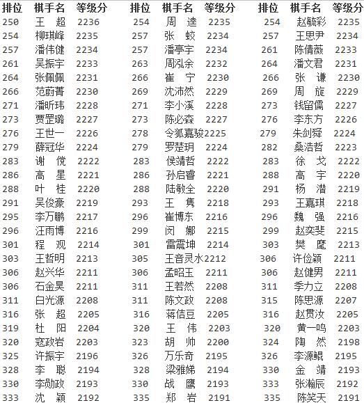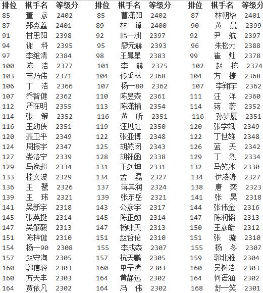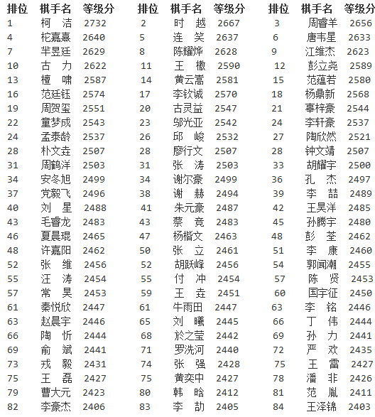 新浪体育讯 日前,中国棋牌网公布了2016年4月中国围棋等级分正式版,与此前公布的公示版相比有些细微出入。柯洁以2732分排名高居榜首,领先排名第二的时越65分,时越、周睿羊分列二三位。古力排名第十。以下是等级分详细情况。