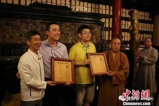 图为对弈结束后,古力九段与孟繁雄获得此次“少林黑白决”的棋盘模型。