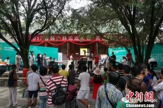 图为众多游客在少林寺方丈室外围观这场江湖挑战庙堂的围棋对决。