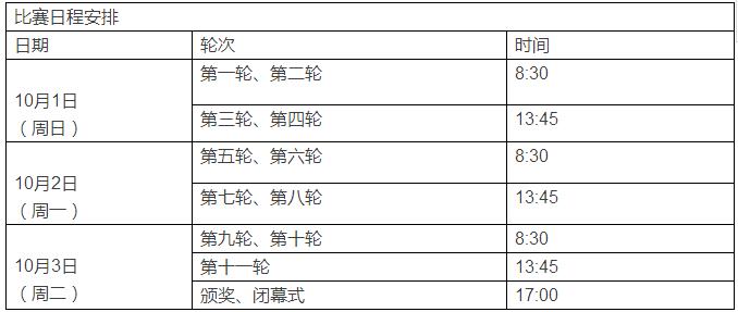 4、外地选手请于10月1日8:15到赛场报到并领取参赛证。