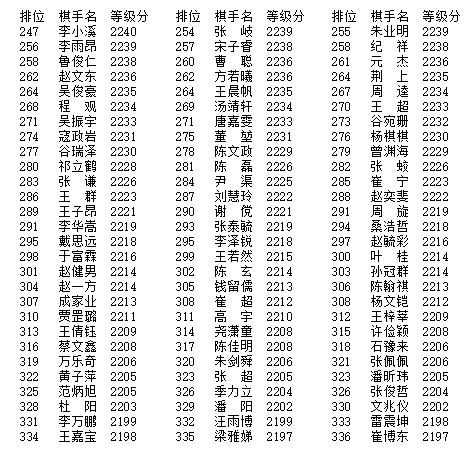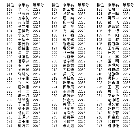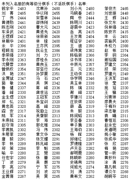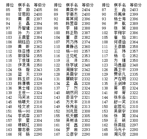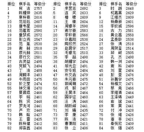 新浪体育讯 近日,中国围棋公布了9月中国围棋等级分公示版,公示期为10月1-9日,柯洁以2757分高居榜首,但与上期2772分相比下滑15分,芈昱廷与时越分居2、3名,以下为详细等级分排名。