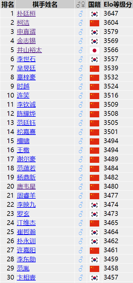 3月12日,Goratings更新了截至11日的世界围棋等级分,韩国的朴廷桓一周两败,积分暴跌21分。柯洁西南王1胜1负积分下降9分,两人分差缩小到43分。