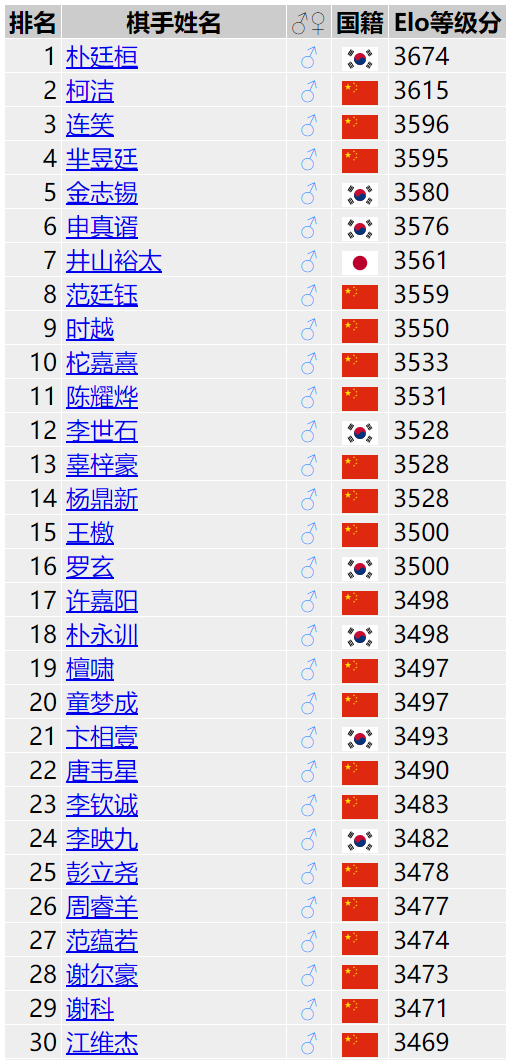6月11日,Goratings更新了截至6月8日的积分排名。韩国的朴廷桓以3674继续排名第一,柯洁以3615排名第二,拉大与排名第三的连笑之间的距离,从上周的5分之差变成了19分。柁嘉熹超越杨鼎新,跻身前十。