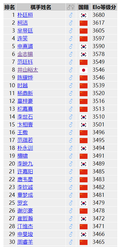 以下为GoRatings截至7月7日的世界围棋积分排名: