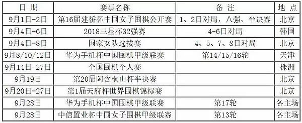 中国棋院近日公布了2018年9月围棋赛程安排。国际棋战,第23届三星杯和首届天府杯将开战。围甲赛会将于9月8日-12日在天津举行。国内比赛,建桥杯继续在北京进行,全国围棋个人赛将落子株洲,阿含桐山杯半决赛也将打响。