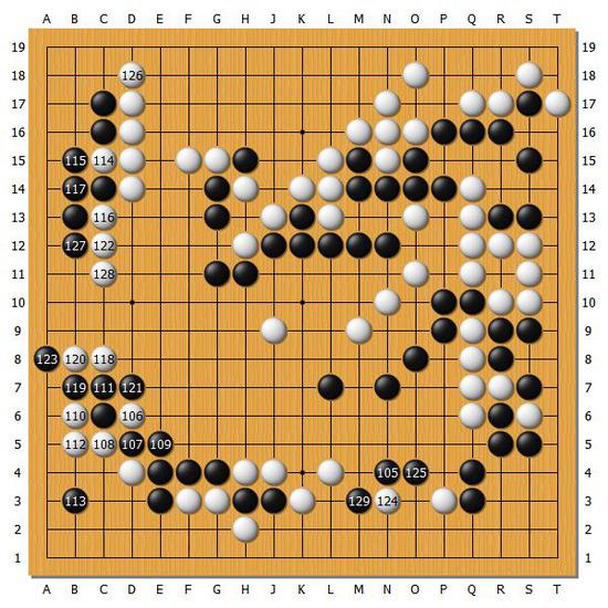 [图5]黑105这手棋咬得非常紧,白106开始想要处理好左下角的白棋,但是实战处理的并不好。