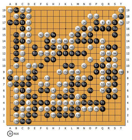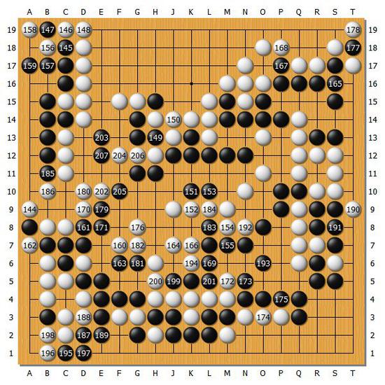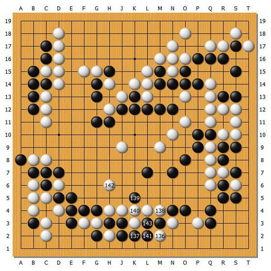 [图9]之后黑141和黑143分断下方白棋之后,黑棋在下方的收获非常大,黑棋也因此获得了胜势。