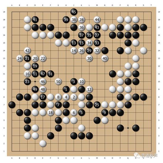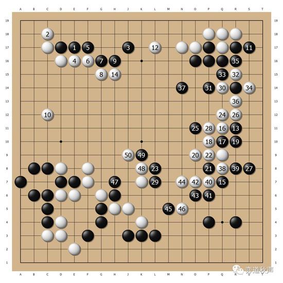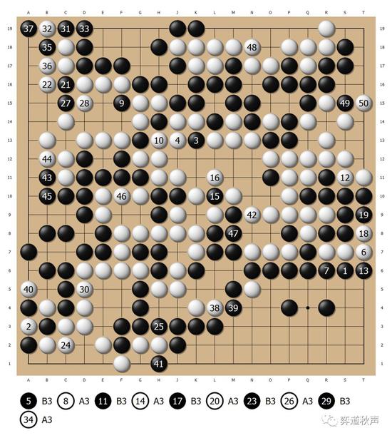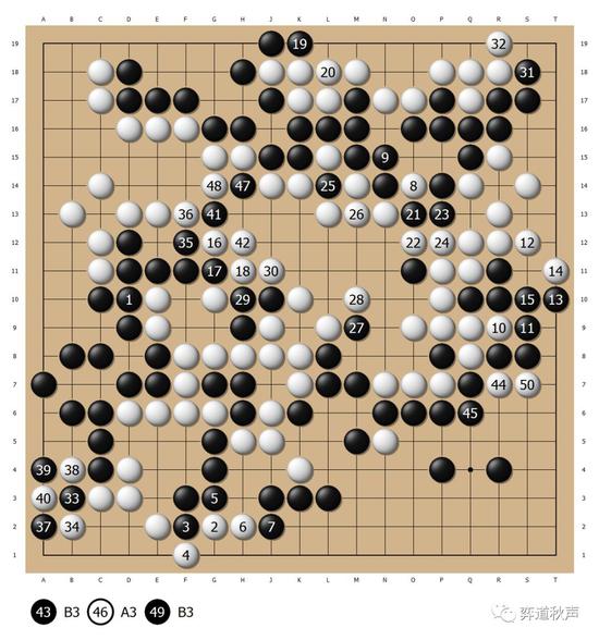 黑31的夹也没啥威力,白棋轻松拔掉一子,再白38、40清楚做眼,黑棋收获甚微,周泓余一举占据优势。