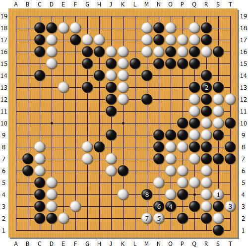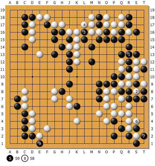 暂停时间结束,白棋果断的走出148手提,李修全一瞬间兴奋起来,在研究时以为黑棋可以向图⑧那样爬回。