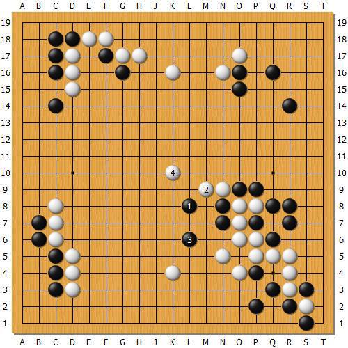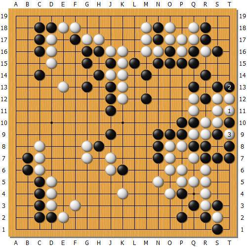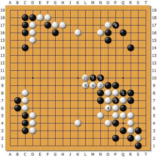 实战白棋打吃,角上被黑棋吃掉右边后局势又接近了。紧接着过了几手,白棋第160下出了本局的败着,应该如图⑩尖强杀黑棋,这样形成一个连环劫,黑棋局部很难做活。实战随手一挡,被黑棋挤一手后局部尽然变成了先手活,再抢到左上的并,白棋已经大势已去了。