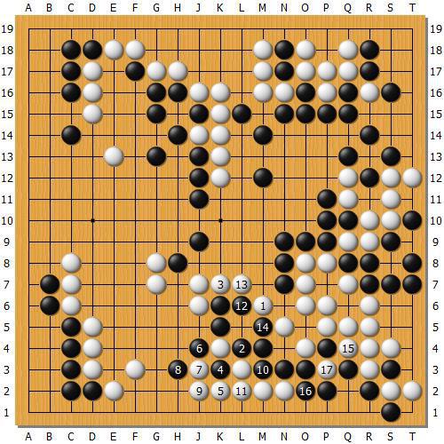 暂停时间一点一点的流逝,在贵阳天元苦思冥想的时候,教练摆出了实战的变化图,经过研究后一致认为白棋右边的对杀只能下出一个缓两气劫,这样的结果没有任何害怕的道理,顿时大家都轻松了下来。