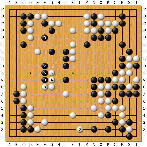 贵阳天元研究后,认为只能先提掉一子再说了。实战白150手也出现了失误,应该走图⑨开劫,本来的缓气劫变成了两手劫对于黑棋来说明显吃了大亏。