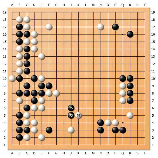 [图5]黑73镇头开始进攻白棋,这手棋可以说是必然。而白74的靠选择了强烈的反击,黑75的长也非常有力。