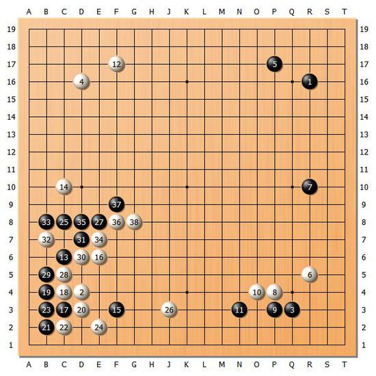 [图1]布局阶段,左下角的进展是头一次见到。从方向来说是黑棋可以接受的局面,也可以说是两分。当然这里白32的点让人印象深刻。黑棋的应对将很大程度影响到本局的走向。