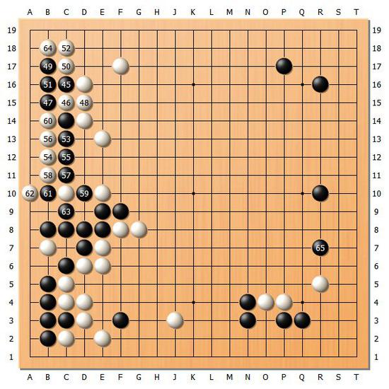 [图3]黑45的托,这手棋其实也可以考虑率先在右下角动手。从右上角的结果来看,黑55在白56位挡住的话可以活棋,但是黑棋实战选择了弃子,最终收获先手后抢到了黑65,从全局来看依旧是一场好胜负。