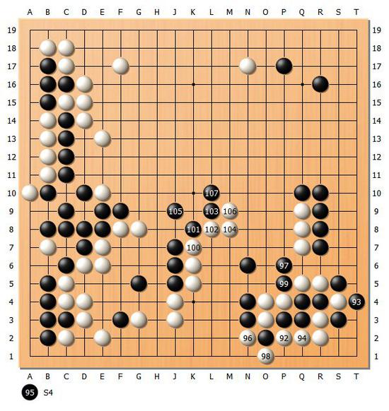 [图6]左下角的战斗之后,感觉黑棋要好下了不少。当然黑91的当初,可以考虑在A位立下。这里的判断还是比较困难的。