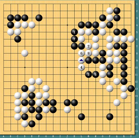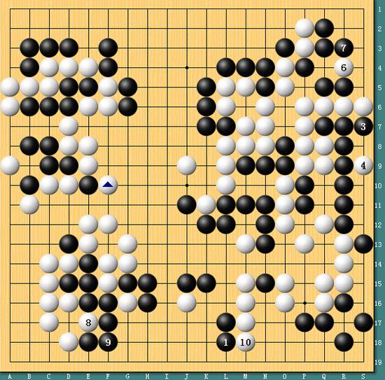 图五,一力辽不会了。实战中杨鼎新1位立,一力辽此时先是逼迫黑棋劫争妥协,杨鼎新只能在9位粘。这时候白棋只要10位挡,看轻右边的收气杀即可,10位挡官子价值太大了。而右边的收气从后边来看,总是避免不了的,实战中一力辽右下大龙虽然做活,但目数亏得一塌糊涂,形势变得十分微妙。