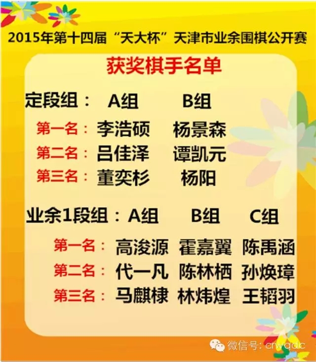 2015年第十四届“天大杯”天津市业余围棋公开赛获奖棋手名单