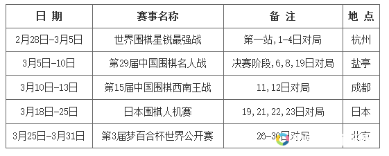 中国棋院近日公布了2017年3月围棋赛程安排,国内赛星锐战,西南棋王战,名人战开赛,国际赛中梦百合杯亦拉开序幕。