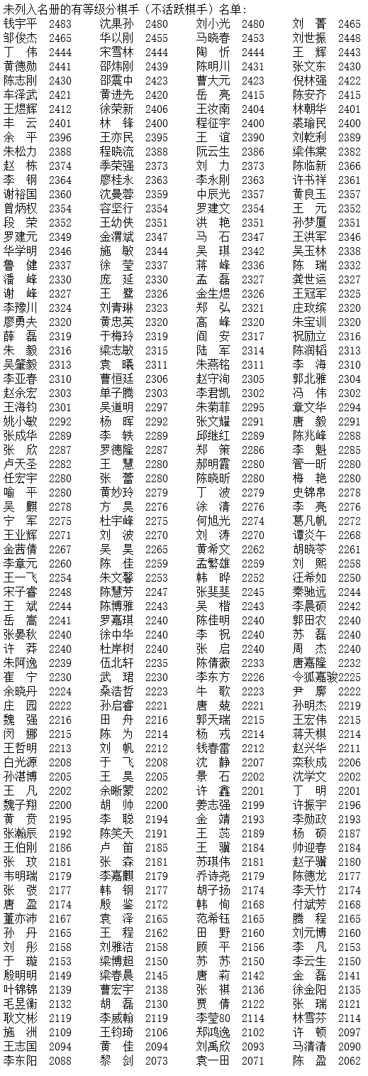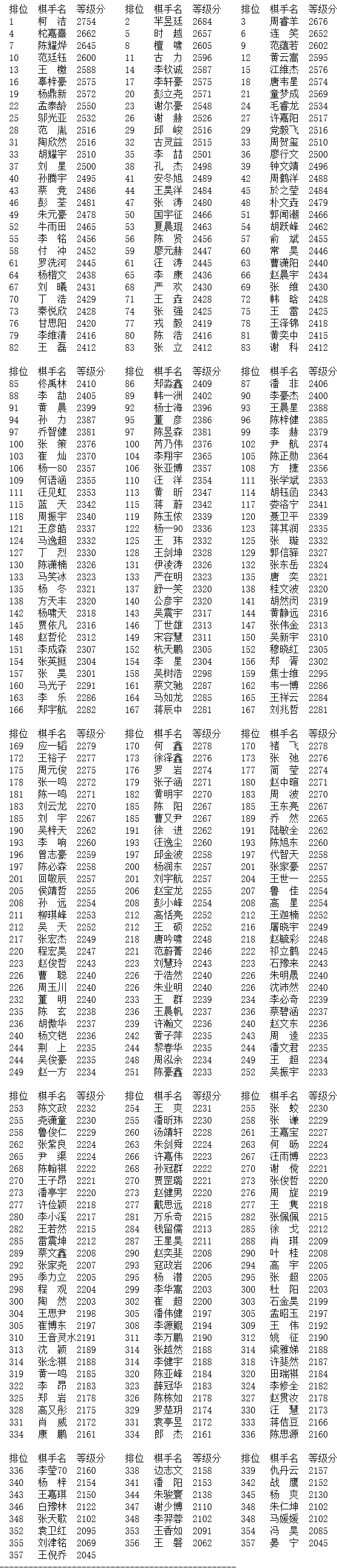 3月1日,中国棋院发布了2月职业棋手等级分公示版。柯洁继续高居榜首,芈昱廷升至次席,时越升至第五,刚刚终结农心杯的范蕴若排在第九。李翔宇等3人升四段,以下为详细排名。