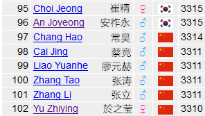女子方面,崔精LG小组预选赛状态极佳,连胜柳秀沆、玉得真、金美里、崔宰荣4位韩国棋手晋级本赛。而於之莹在预选小组赛中不敌韩新初段李鱼德东,积分下降12分,排名从上周88位骤降到第102位。目前崔精暂时以3315第95位成为女子第一。