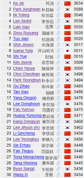 上周的LG杯比赛中韩对抗中国以3比13惨败,芈昱廷在小组预选赛中爆冷不敌尹峻相积分下跌9分,不过由于和李世石积分还有差距排名并未下降。时越小组预选决赛不敌金志锡,积分下降10分,排名也下降2位从第8位来到目前第10位。辜梓豪不敌朴永训,积分下跌9分,排名也从上周12位下降到了第15位,被朴永训超越。目前朴永训以3494分领先辜梓豪1分排在第11。