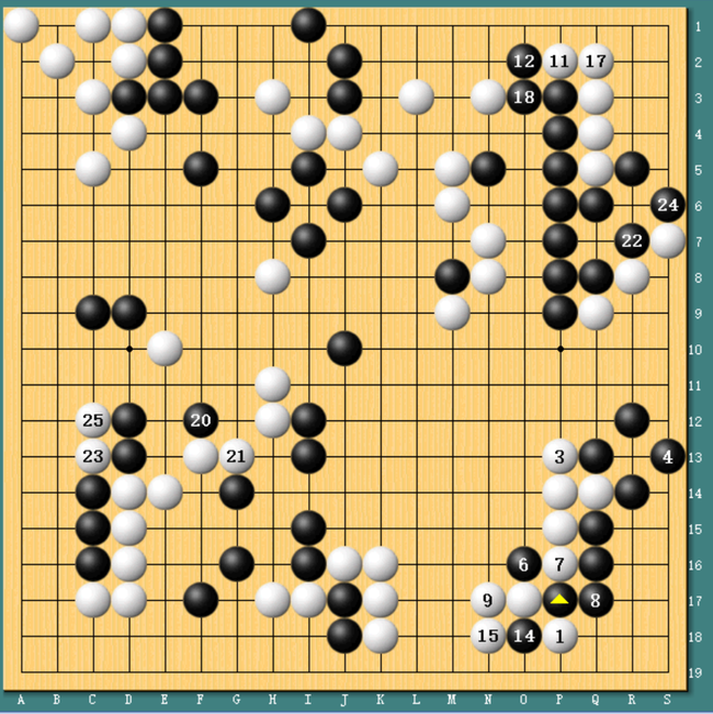 中国队执黑VSAlphaGo。黑棋在等待机会,“死了也要提劫”。周睿羊黑14断来找劫,但当AlphaGo白17右上二路粘时,周睿羊正准备跟着三路接住被紧急叫停,大家讨论一番周睿羊18还是接在三路。接着黑20靠找劫,AlphaGo也跟着应劫,白23断在左边三路,古力:这是最小的劫材了,看来白棋认为已经够了,黑棋不能再应,必须消劫。差距还是缩小了。