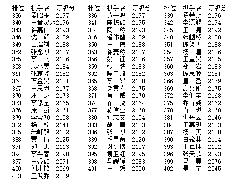 新浪体育讯 近日,中国围棋公布了9月中国围棋等级分公示版,公示期为10月1-9日,柯洁以2757分高居榜首,但与上期2772分相比下滑15分,芈昱廷与时越分居2、3名,以下为详细等级分排名。