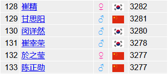 女棋手方面,韩国棋手崔精排名最高,3282分居第128位。中国棋手於之莹以3277分从上周的第145位上升到132位,排在女棋手的第二位。