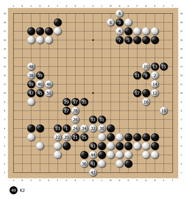 白40以下次序井然,到白48粘上,白棋活得很大,满意。