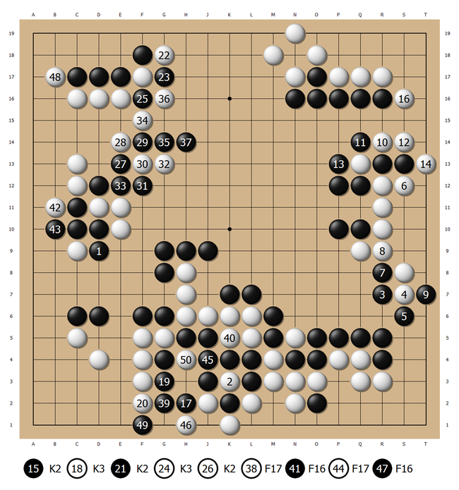 黑9点三三,白16还以颜色,这样的开局在AlphaGo自战对局中出现过以后,人类高手屡屡效仿。