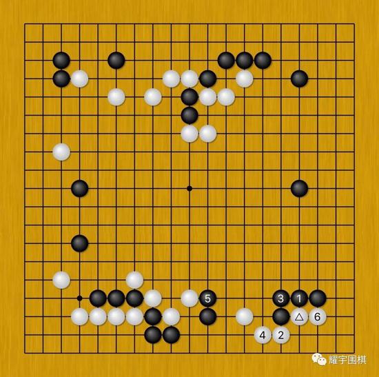 图7:前图白2扳的时候,黑3若是不给白棋借用,直接粘上如何?白4退冷静,接下来黑5和白6两点必得其一,黑5若是出头,白6爬之后,黑无忧角变成了白棋的角,虽然没有封锁住黑棋,但白棋在这里的实地所得已经足以弥补了。
