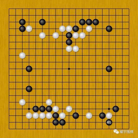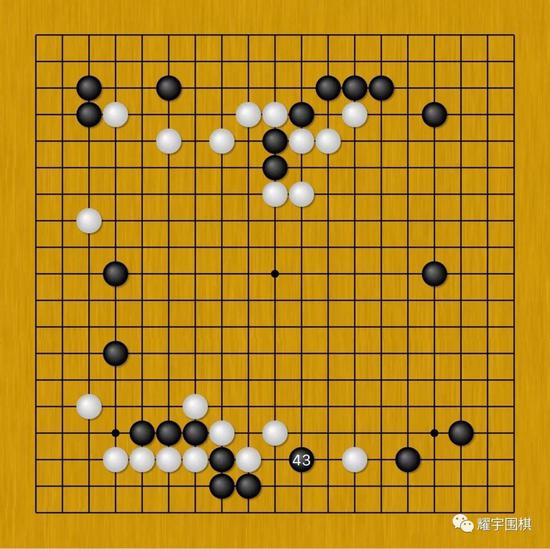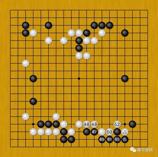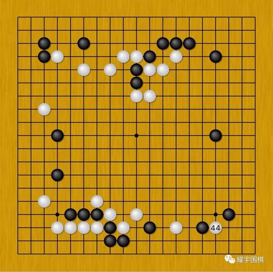 图5:实战自己意识到这里很关键,静静思索中,在脑海里突然闪现了赵治勋老师曾经下出过的一步妙手,正好可以用在此时此刻,白44内靠,看似送死,却是一步妙手!