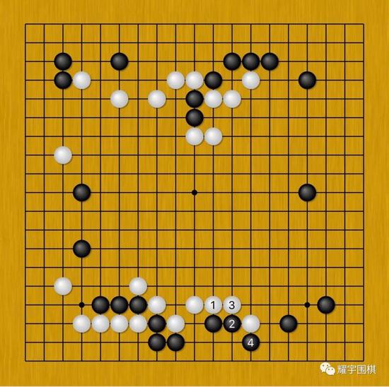 图4:白1压是最普通的下法,黑2以下渡过后,黑不仅安全连络,还顺便捞了不少实地,此图白棋不能满意。但白棋还能有什么选择呢?