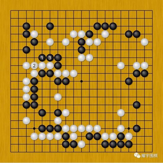 图13:黑89(黑三角)先刺,白1若是粘上,那黑2再夹,情况就完全不一样了!由于黑三角与白1的交换,白左边一块的处境明显比前图差得多!